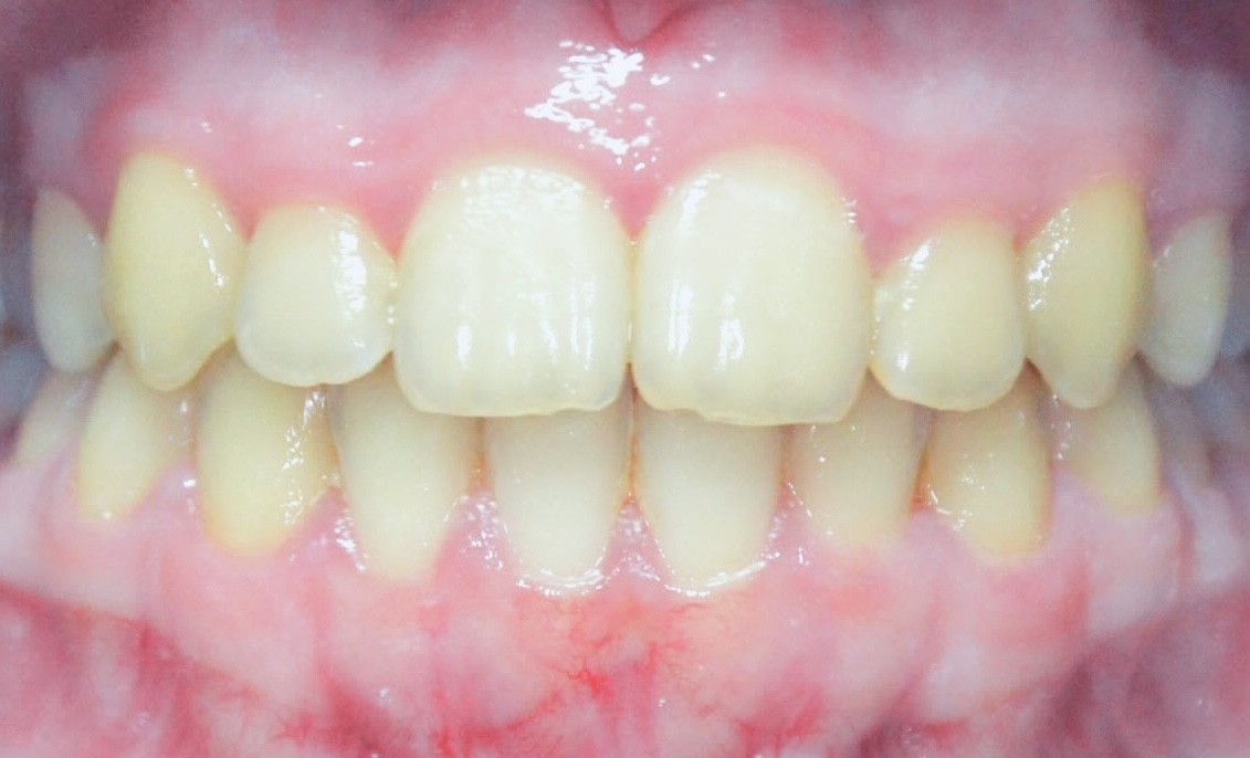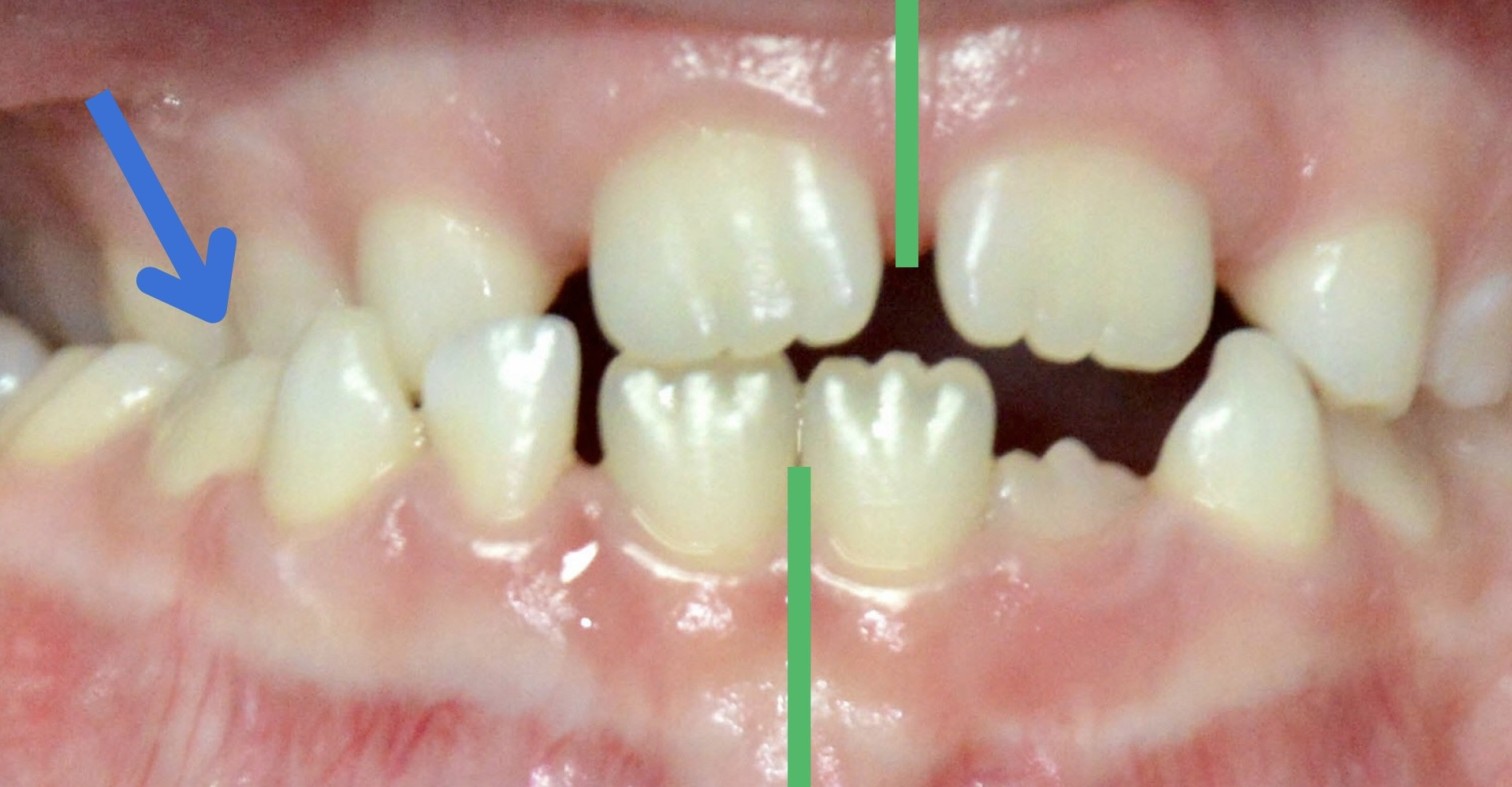 Dadurch stehen die unteren Zähne auf der Seite weiter außen als die oberen. Der Unterkiefer ist zu einer Seite verschoben. Diesen Biss nennen wir Kreuzbiss, da sich ab einem bestimmten Zahn – hier Eckzahn – die Seiten kreuzen. Zusätzlich ist die Mittellinie zur Seite des Kreuzbisses verschoben (grüne Striche).